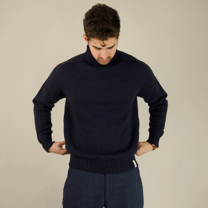 Introducing the world's first fully seamless, 100% British Wool Submariner jumper in classic navy. This iconic design, a staple for the British Navy on their arctic convoys, combines heritage with advanced knitting techniques. Our seamless construction ensures spectacular comfort and a well-built garment that fits snug to size – size up for a more relaxed fit. Each jumper is hand-finished and proudly made by us in the UK from pure British Wool.