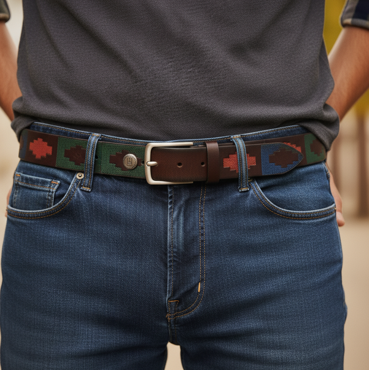 Discover the Miguel Bellido Motif Belt, a testament to meticulous design and quality. Made from genuine leather, this 35mm wide belt offers exceptional durability and an adjustable fit for ultimate comfort and versatility. It features a striking satin black nickel buckle, elegantly enhanced with a distinctive blue painted logo. What truly sets this belt apart are the vibrant native motifs that adorn its surface, adding an eye-catching and artistic flair to any ensemble. Perfect for those who appreciate quality and a touch of cultural inspiration in their accessories.